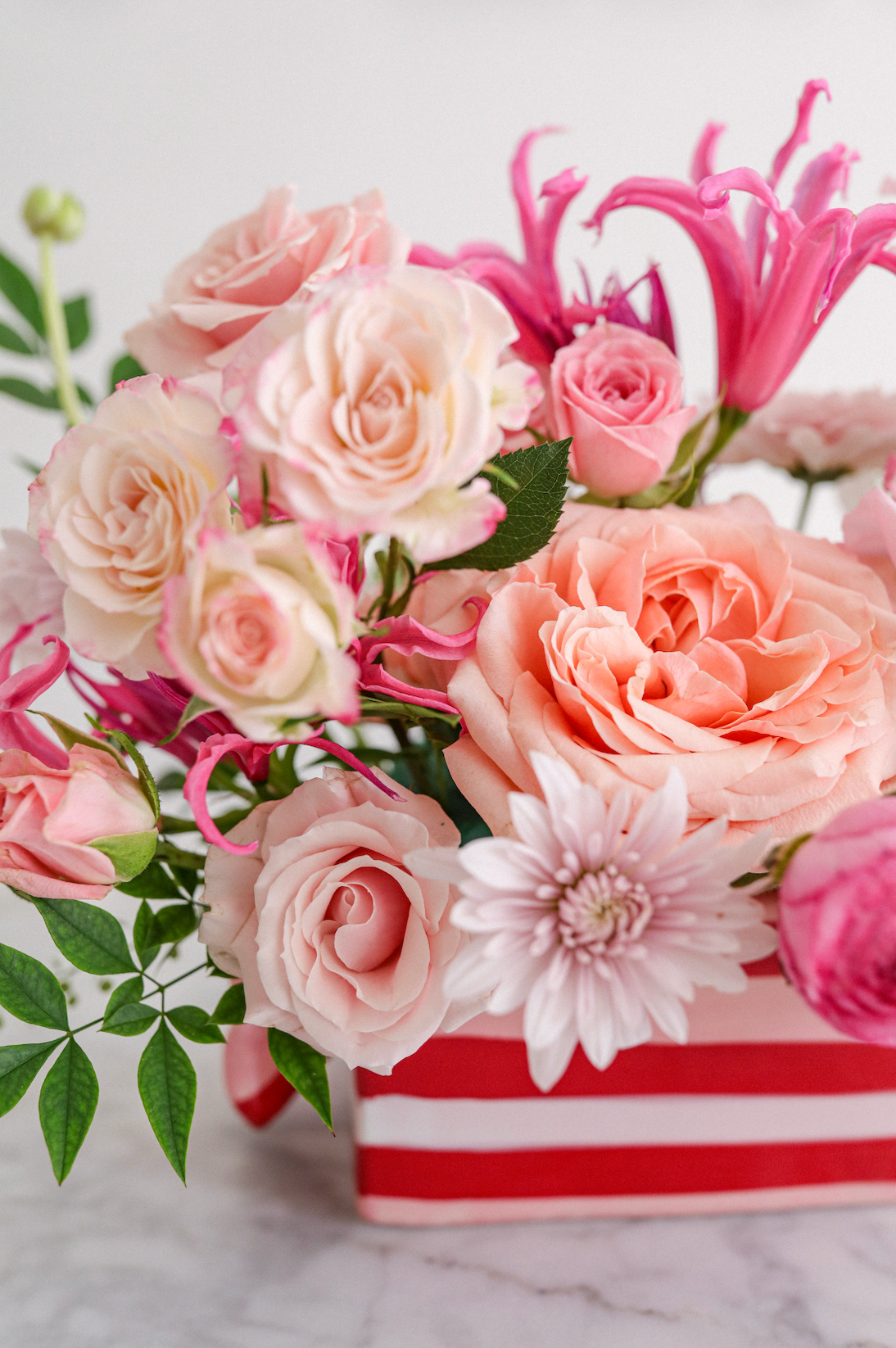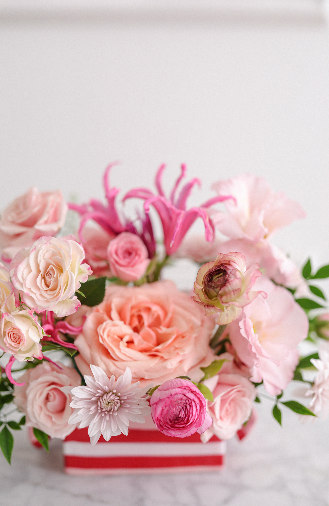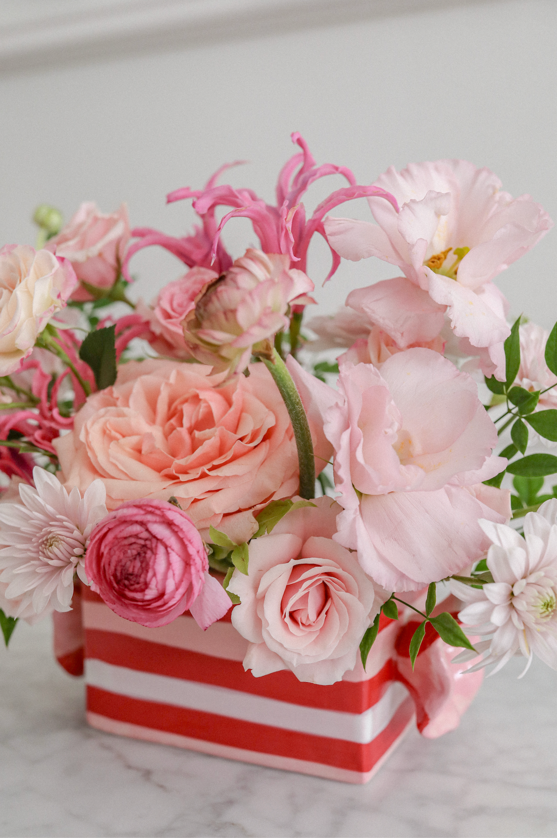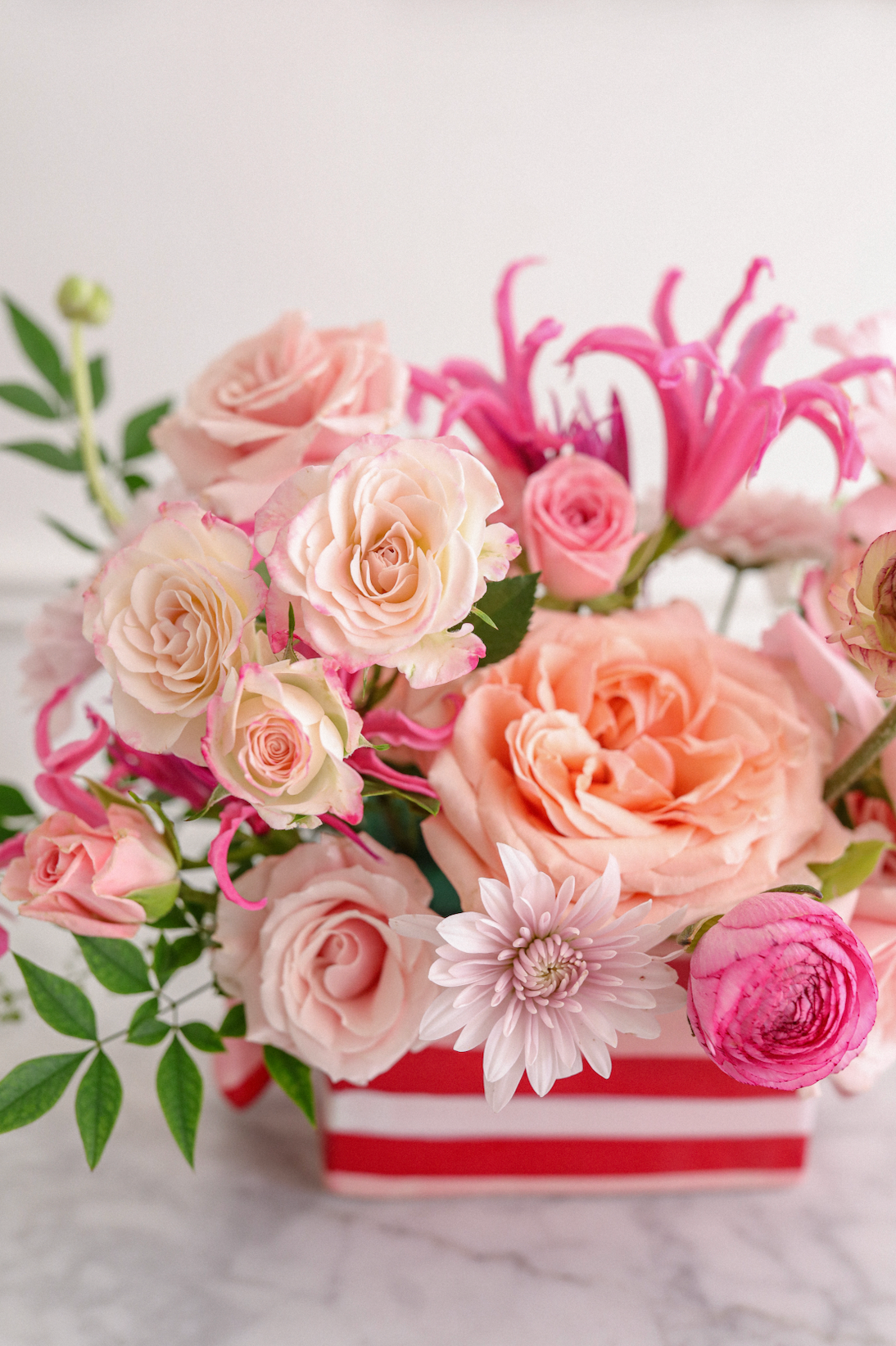 Candy Crush is a Valentine’s Day floral arrangement inspired by sweet moments, soft romance, and playful love. Featuring a lush mix of blush and peach roses, ranunculus, lisianthus, chrysanthemums, and vibrant pink accent blooms, this design is full of movement, texture, and warmth.